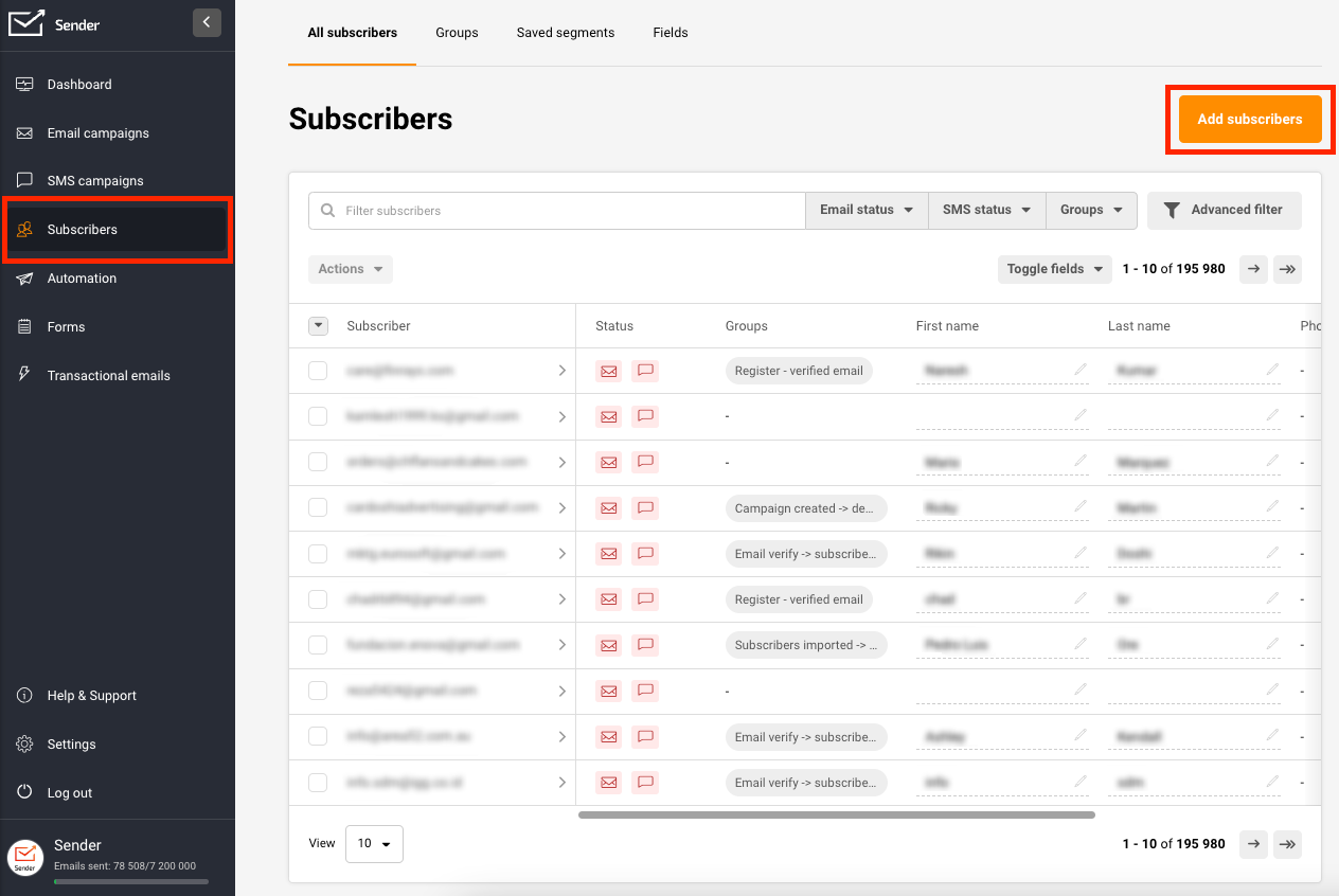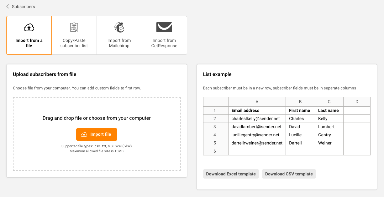 Subscribers can be imported via subscription section or by opening particular group and adding recipients within it. Let’s start by opening the Subscribers’ section and clicking the “Add subscribers” button.