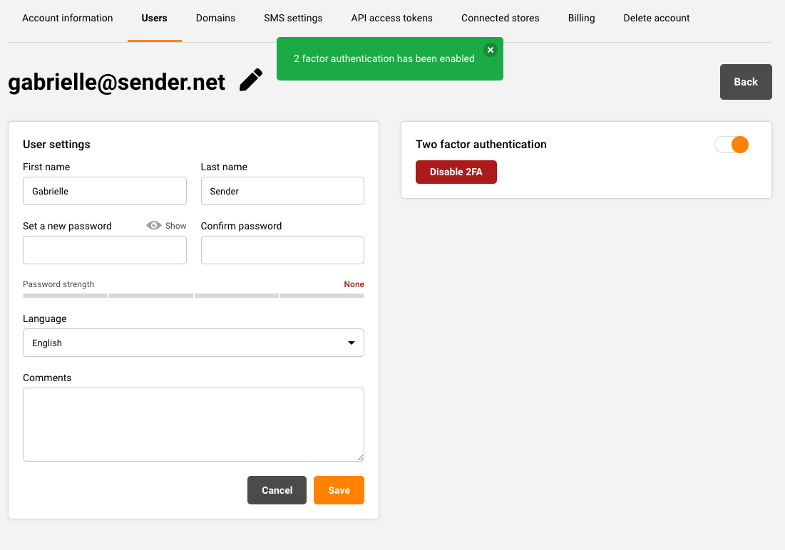 Once the code is entered, the 2FA gets enabled.