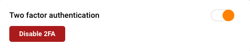 Then either click the “Disable 2FA” button or switch the “Two factor authentication” toggle.