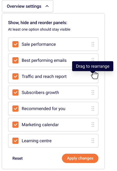 - Overview settings – you can customize the layout of your dashboard by dragging and dropping sections to organize it exactly how you want. You can also exclude sections from the dashboard that you feel are irrelevant to you by unticking the boxes.