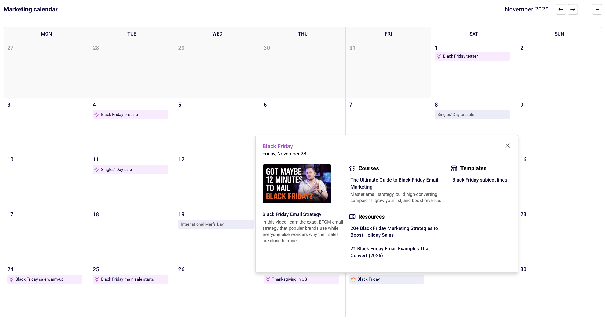 - Holiday markers – Important dates like Halloween, Thanksgiving, Black Friday, Diwali, and other seasonal events. These also include educational materials on marketing strategies for these holidays.
