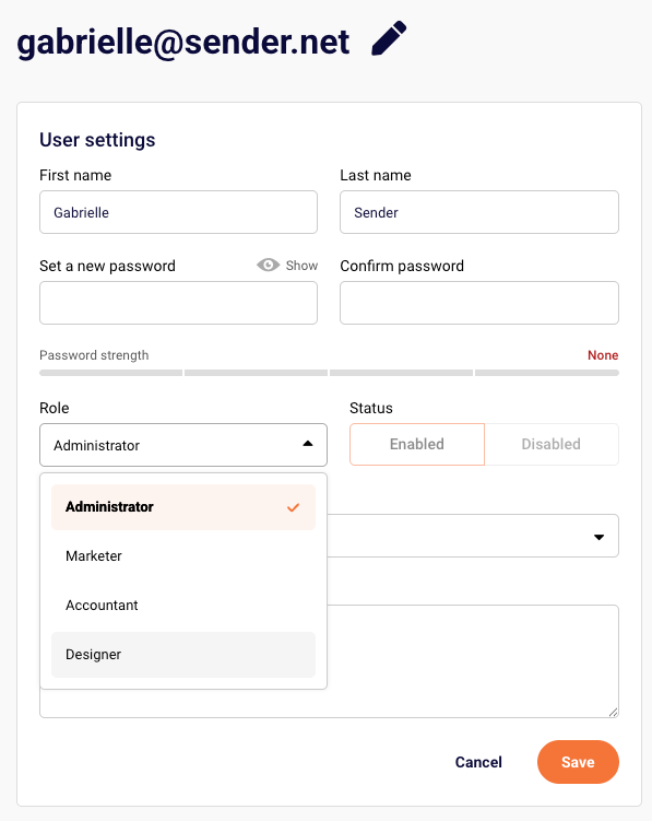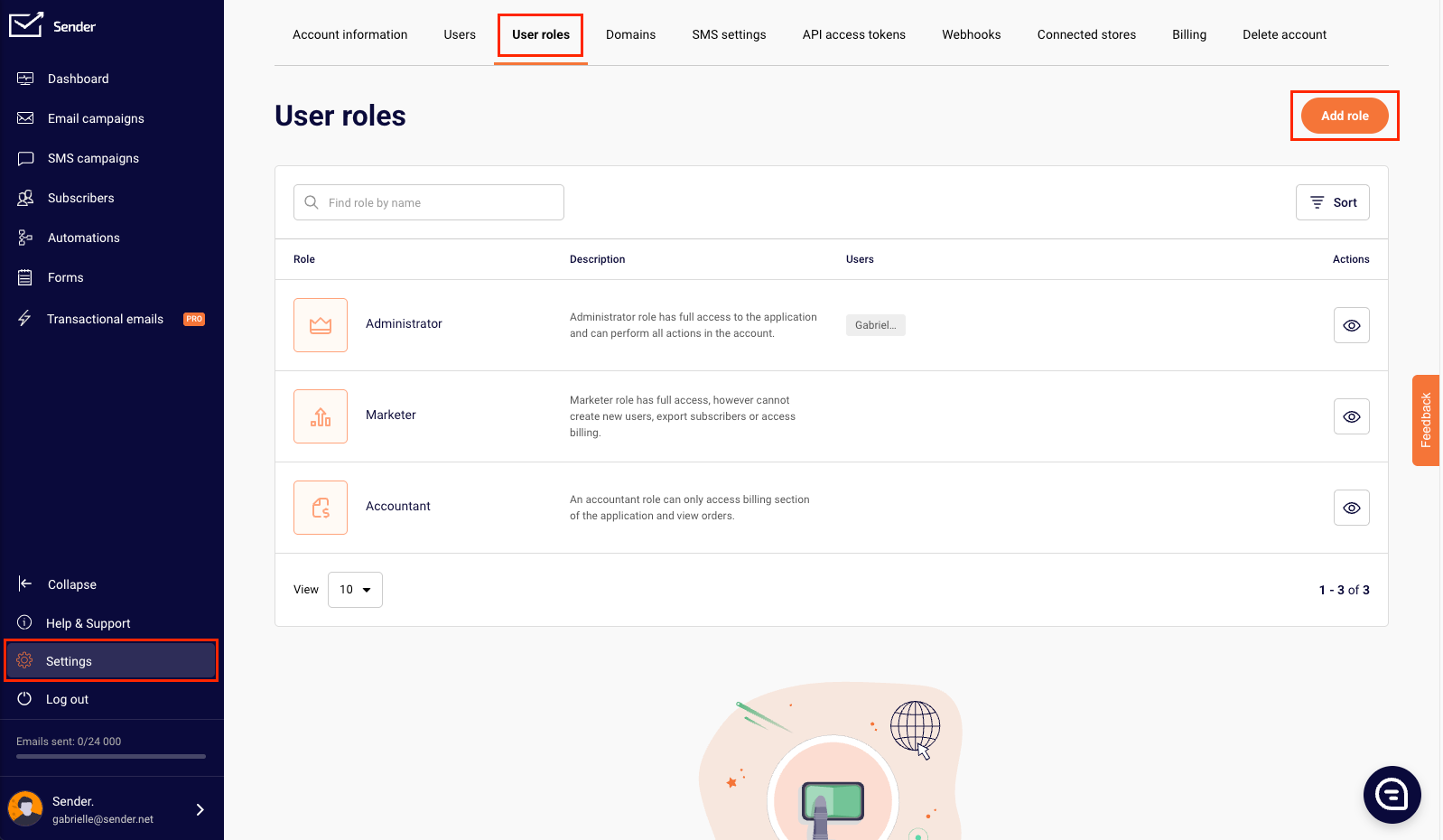 Managing who can access what on your account is simple with user roles. By default, there are three predefined roles available: Administrator, Marketer, and Accountant—each with different levels of access and responsibilities.