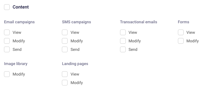You can control the level of access the user has to content-related features. This includes the ability to view, edit, or send Email, SMS, and Transactional campaigns; manage Forms; access and modify the Image Library; and view or edit Landing Pages.