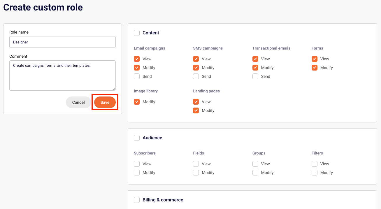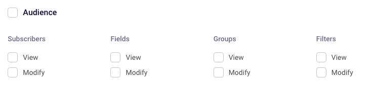 The Audience section lets you define the user’s access level for managing subscriber data. You can specify whether they can view or modify subscribers, custom fields, groups, and filters.