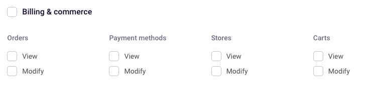 The Billing and commerce allws you to select permissions to view or modify orders, payment methods, stores and carts.