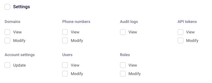 Lastly, the Settings section allows you to choose how much access the user has to control the account and its core components: domains, phone numbers, audit logs, API tokens, account settings, users, and their roles.