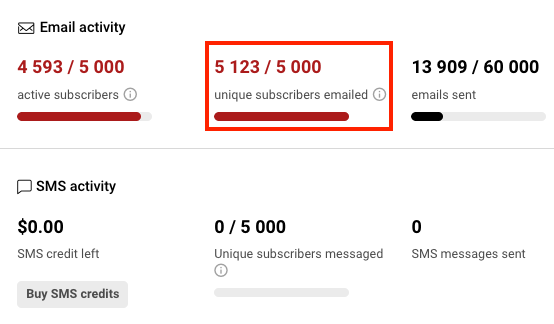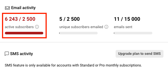 - Unique subscribers – the total number of unique email addresses you’ve sent emails to in the current plan period.