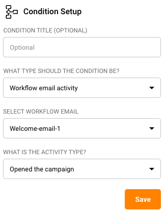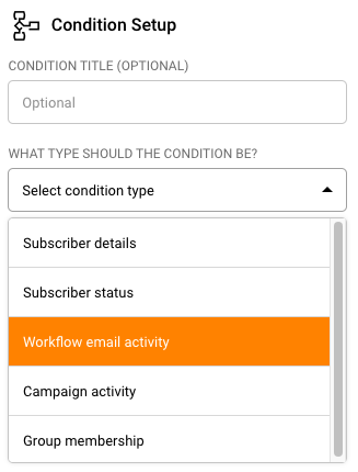 Give your condition a name and choose the condition type as “Workflow email activity”.