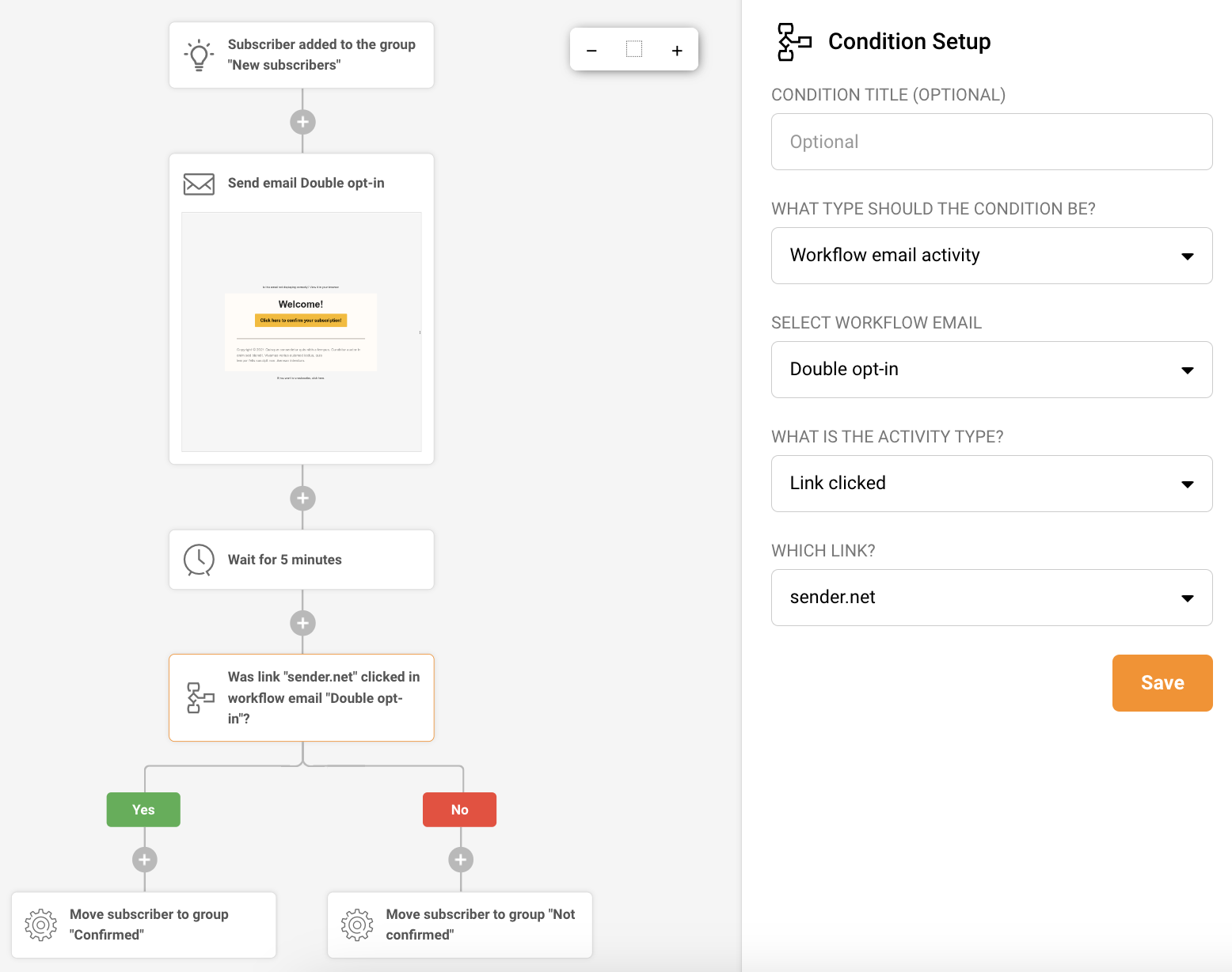 When a subscriber clicks on the confirmation link, they will be moved to the “Confirmed” group. But a few more configurations are needed. Let’s continue by adding the following steps to the automation’s sequence: