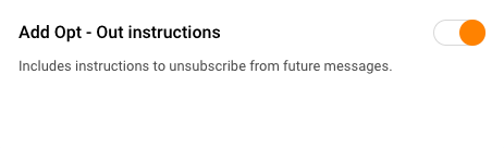 You can also add an unsubscribe link to make this process easier for your recipients. This will allow to quickly unsubscribe from your content and prevent any possible spam reports from them. Simply swich the toggle to “Add Opt – Out instructions” in the SMS campaign Settings tab:
