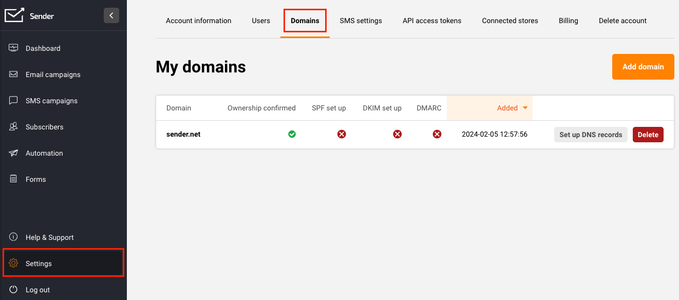 Go to “Settings” -> “Domains” -> Click “Add Domain”.