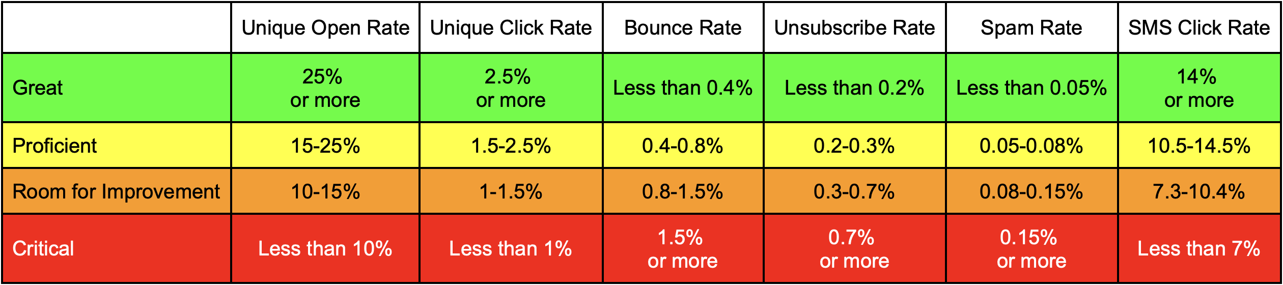 - Actively track key engagement metrics for each campaign. The following chart can help you understand where your campaign performance stands: