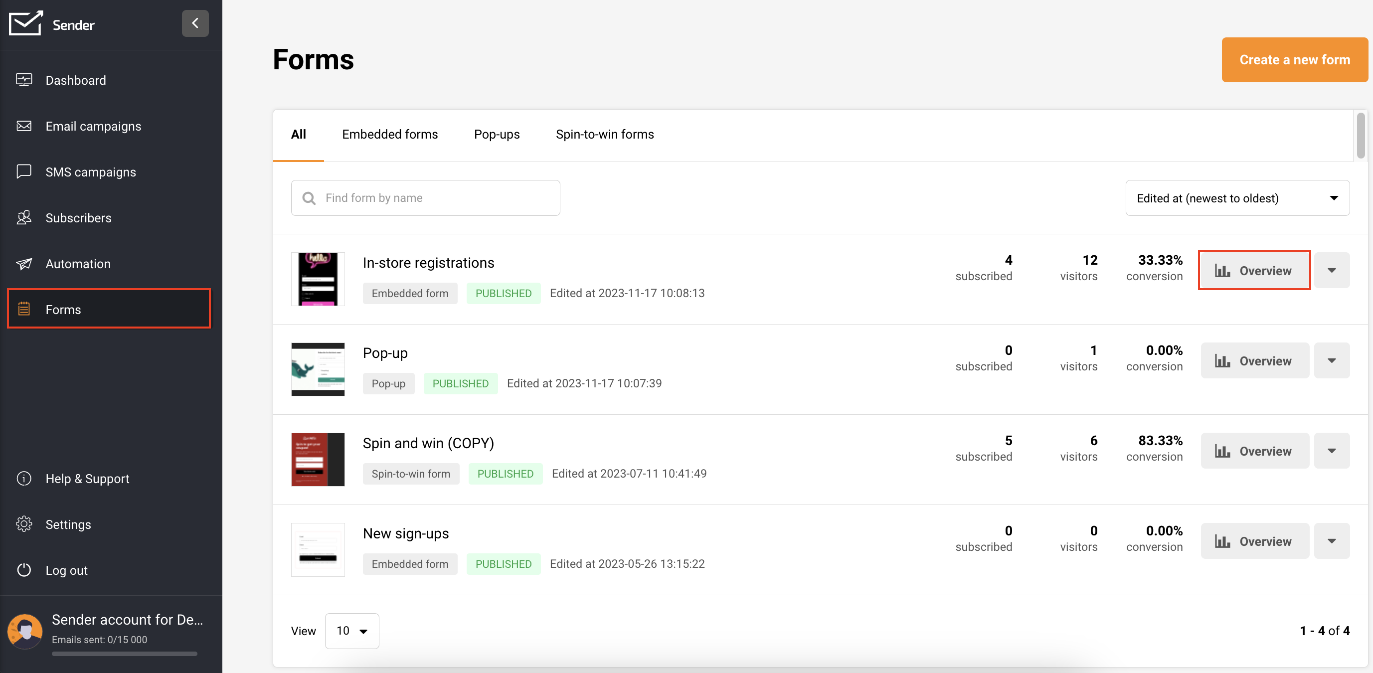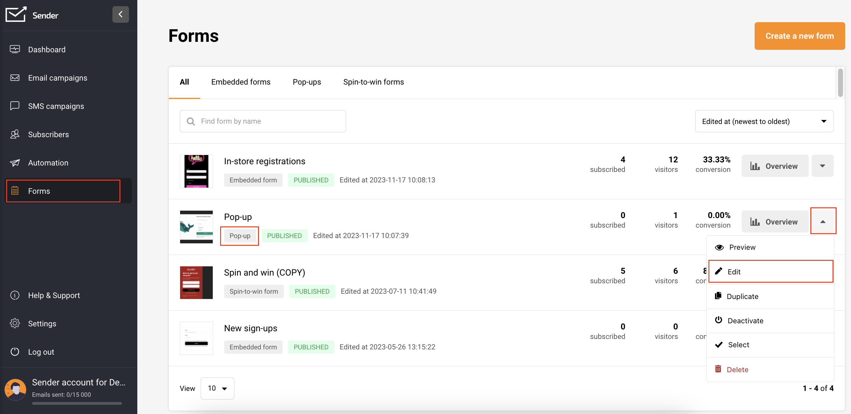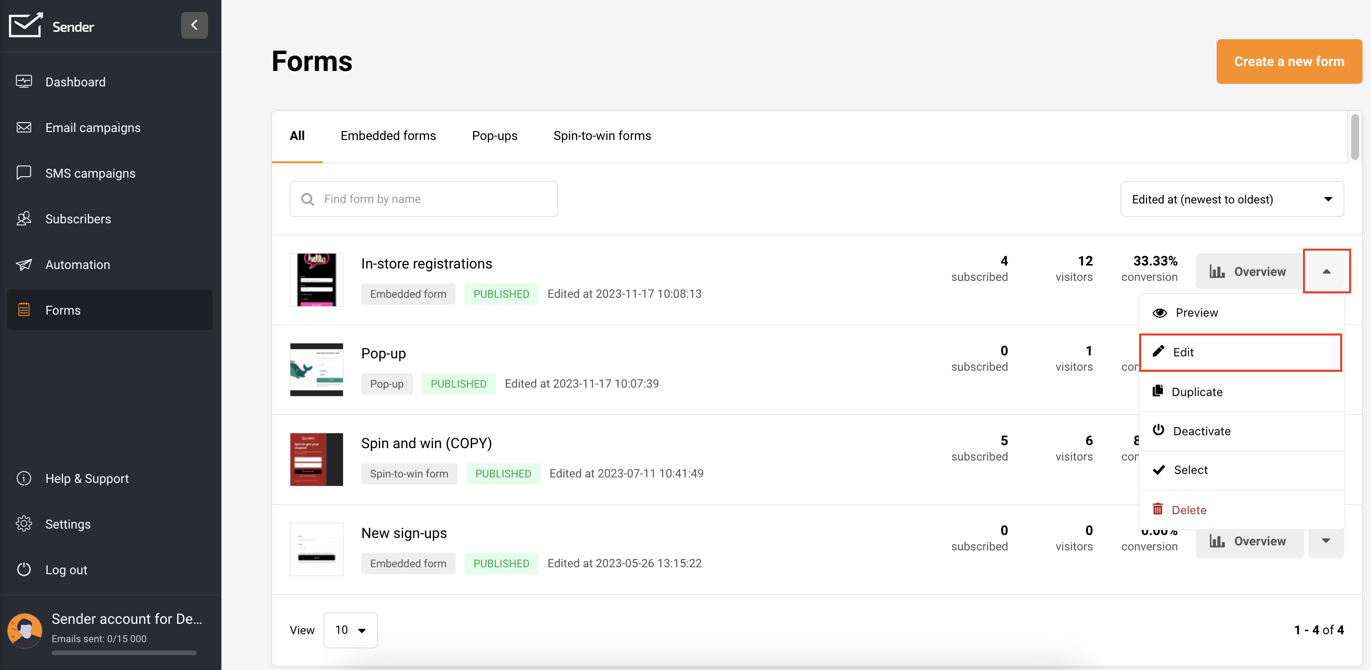 In your Sender account, go to Forms and select “Create a new form” if you haven’t already. Follow this tutorial to create an embedded form. To edit an existing form, click the arrow button next to “Overview” and choose “Edit.”