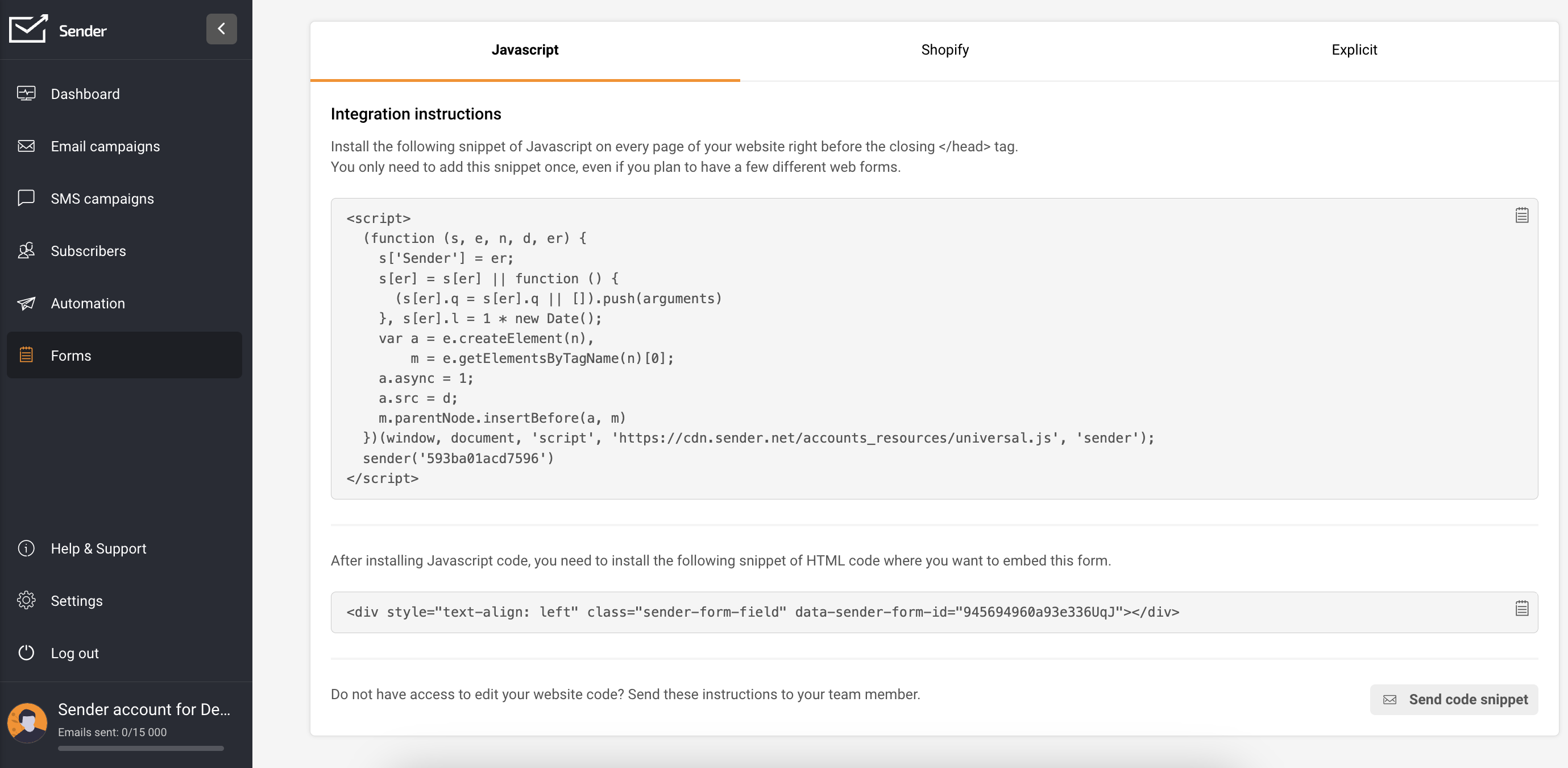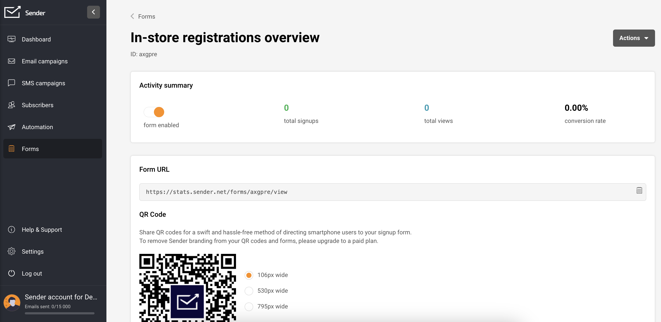 Navigate to the Forms section within your Sender account. If you do not have a form already, choose “Create a new form” by following these instructions.