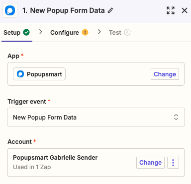 Once you choose the trigger app, choose the trigger event to be “New Popup Form Data” and connect your Popupsmart account to Zapier.