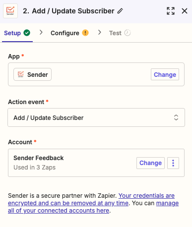 Set up the action event to be “Add/update subscriber” and connect your Sender account to Zapier.