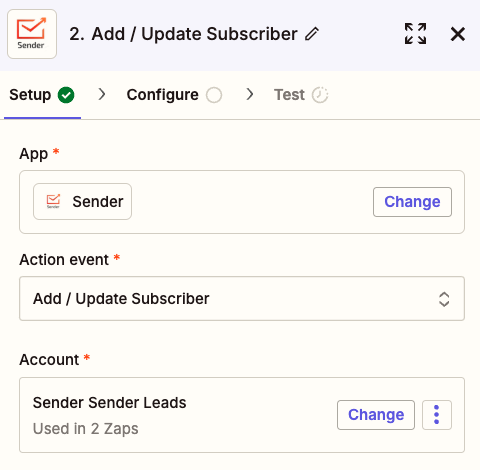 For the action event choose “Add/Update Subscriber” and connect your Sender account.