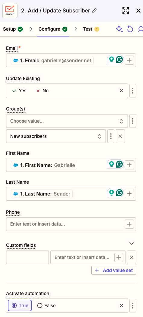 - In the “Configure” step, align Salesforce fields with the corresponding fields in Sender to ensure precise data transfer to your custom fields.