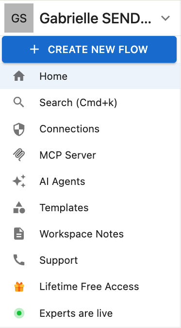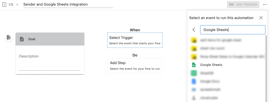 In the flow builder, name your flow and click “Select trigger” to search for the app you want to connect with Sender. For this tutorial, we will connect Sender and Google Sheets.