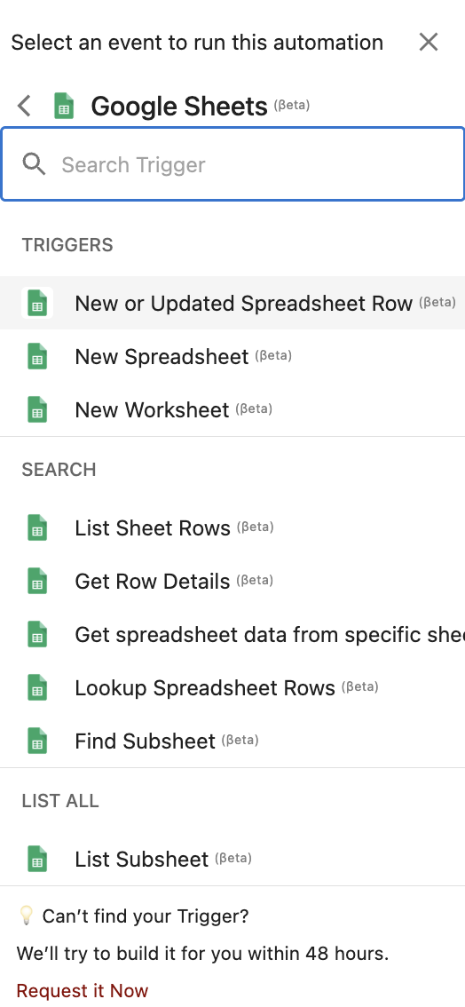 In this case we will choose “New or Updated Spreadsheet Row”.