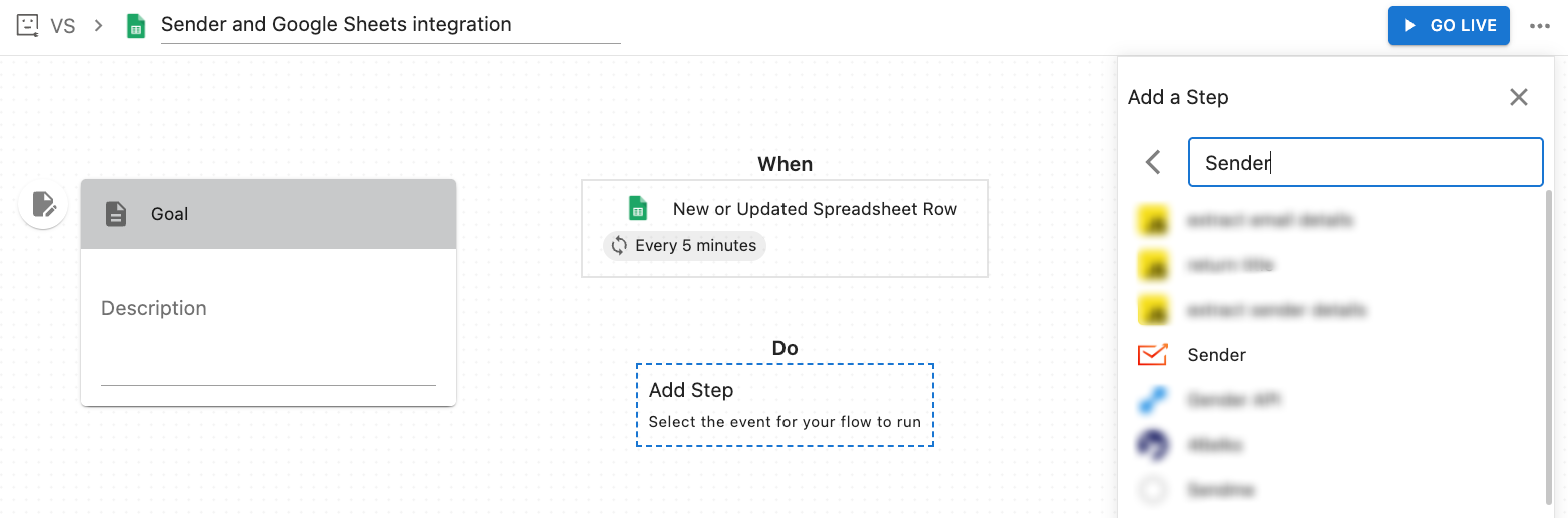 To setup Sender part of the integration, click “Add step” under “Do” (action part of the conntection) and search for Sender in the app list.