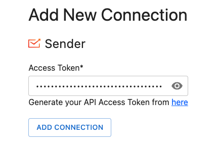 To finalize the integration, Sender accout has to be connected too. This will require you to provide an API token from your Sender account. Click here to learn how to create your account API token.