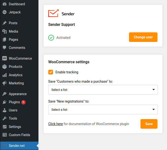 When Sender’s plugin for WooCommerce is successfully installed, Sender.net section will appear on the left side. Select “Sender.net” section to open integration settings.