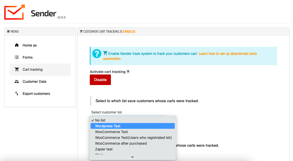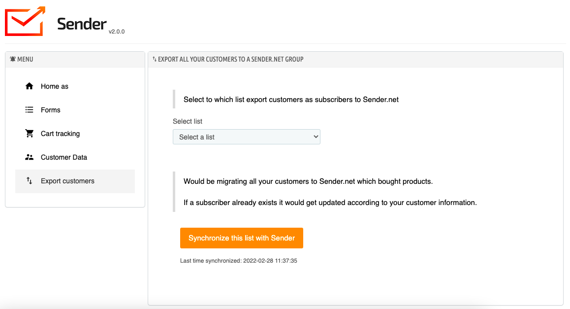Simply select the list that you want your customers to be added to and click Synchronize this list with Sender: