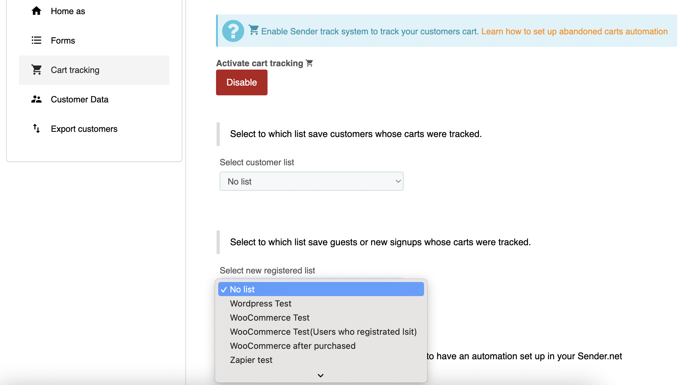 If the customer is new, select the same or a different list to which save guests or new signups whose carts were tracked.