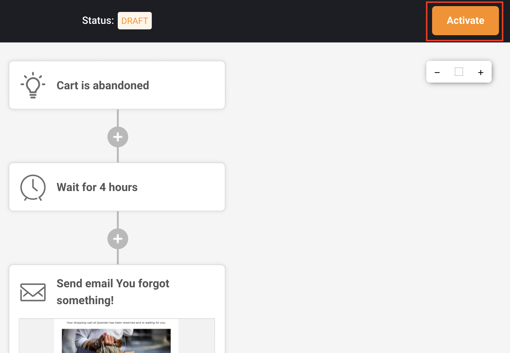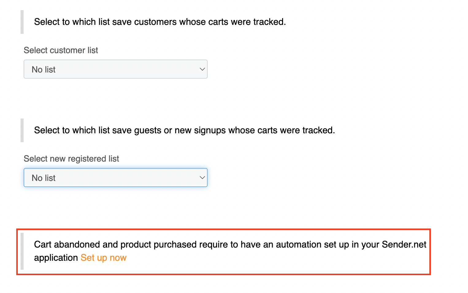 Now it is possible to create automated Abandoned cart and Product purchased workflows. If you do not have one yet, simply click Setup now.