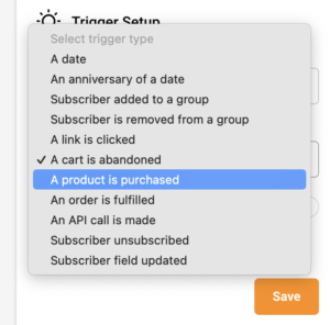 Choose the trigger A product is purchased or A cart is abandoned to set up the automation.