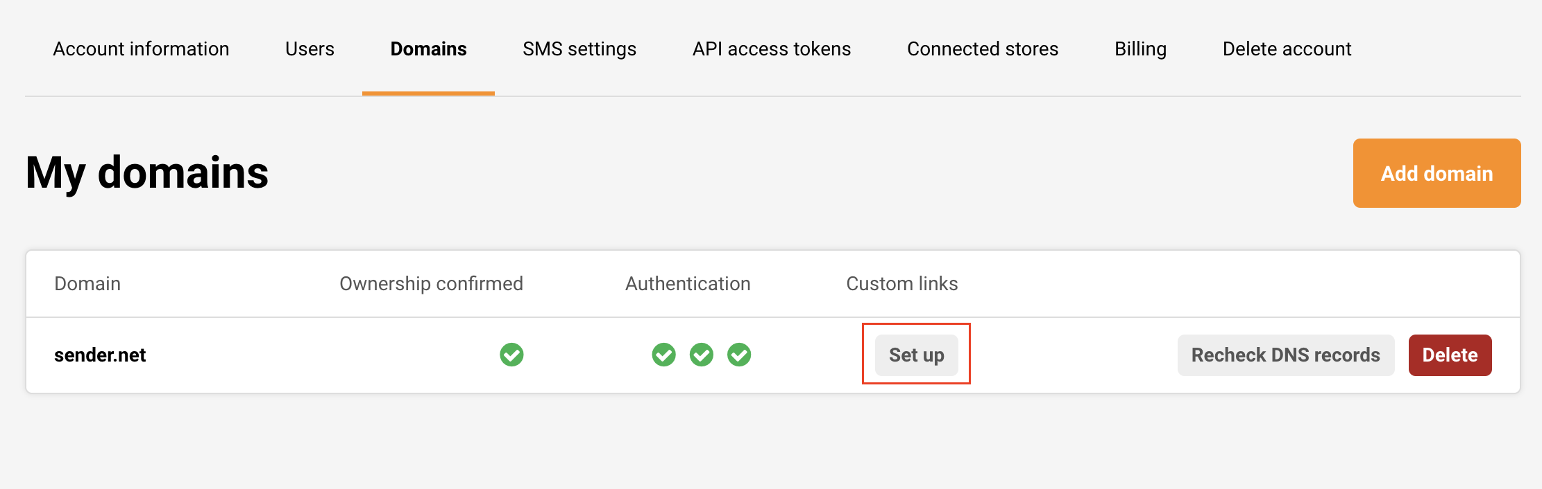 Setting up custom links is simple. Go to your Settings -> Domains and click “Set up” next to Custom links.