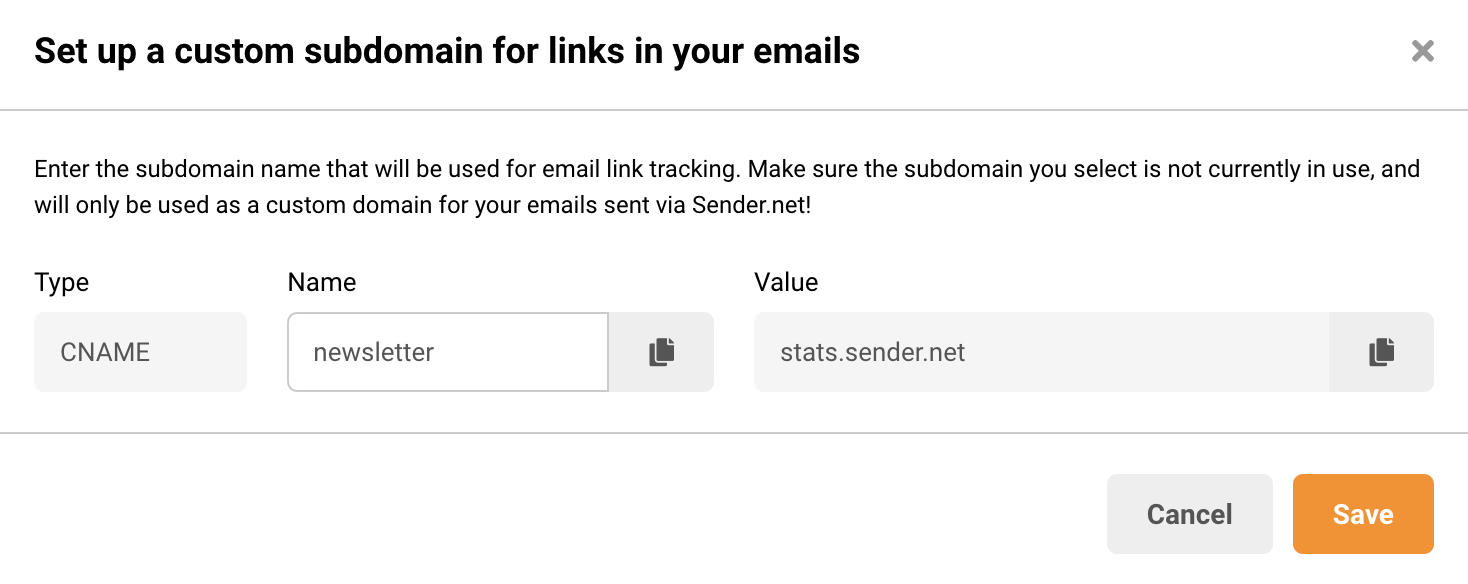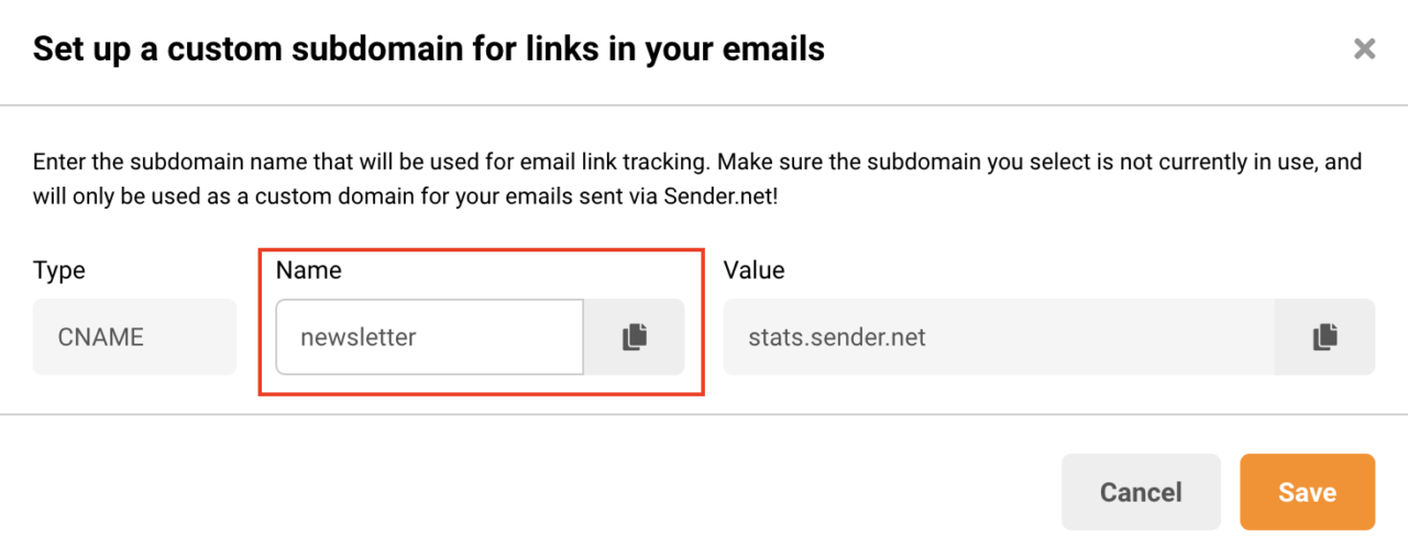 Ensure that the subdomain you choose isn’t currently in use and is dedicated solely as a custom domain for your emails sent through Sender.net.