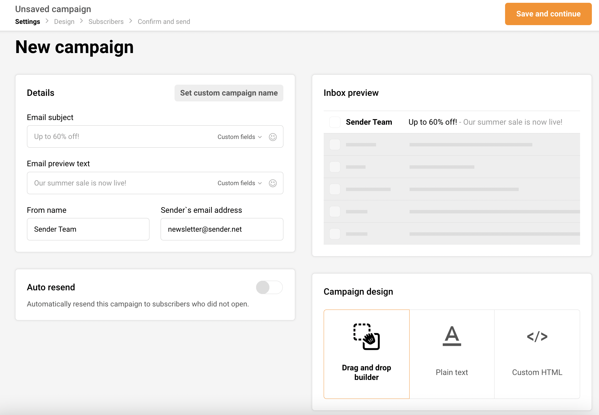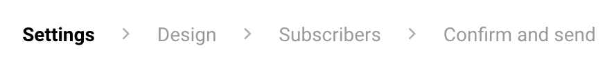 Let’s start by clicking on a “New campaign” button on the top. After the button is clicked, you will be brought to the first step of campaign creation called “Settings” – Here, you will need to input the email subject, sender’s name, etc.