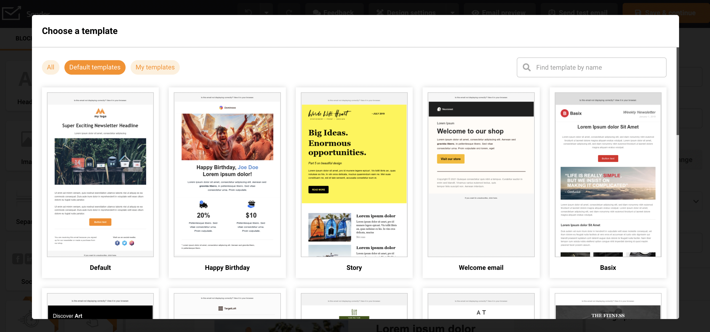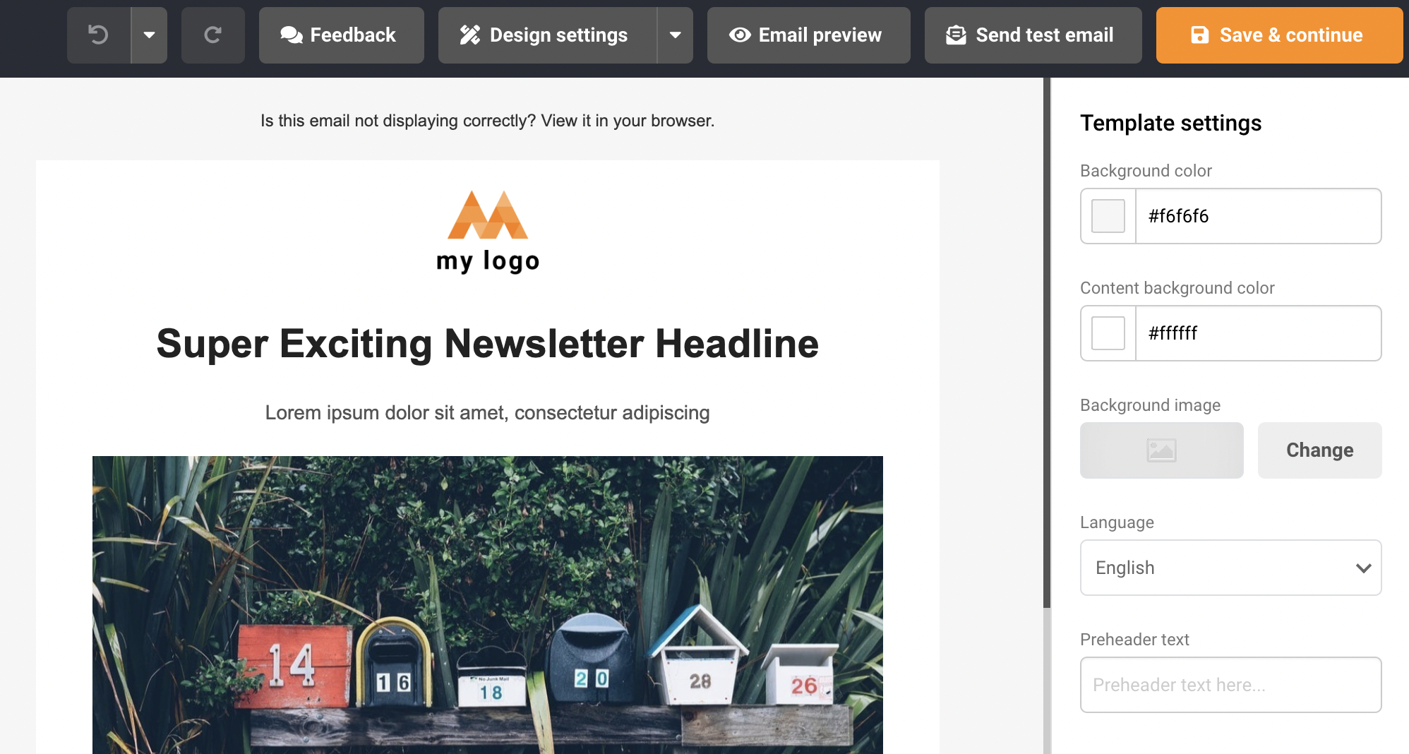 Next, continue with newsletters design – when you finish with design, click on “Save and continue” and proceed to the next step. A comprehensive guide on Drag & Drop editor is found here.
