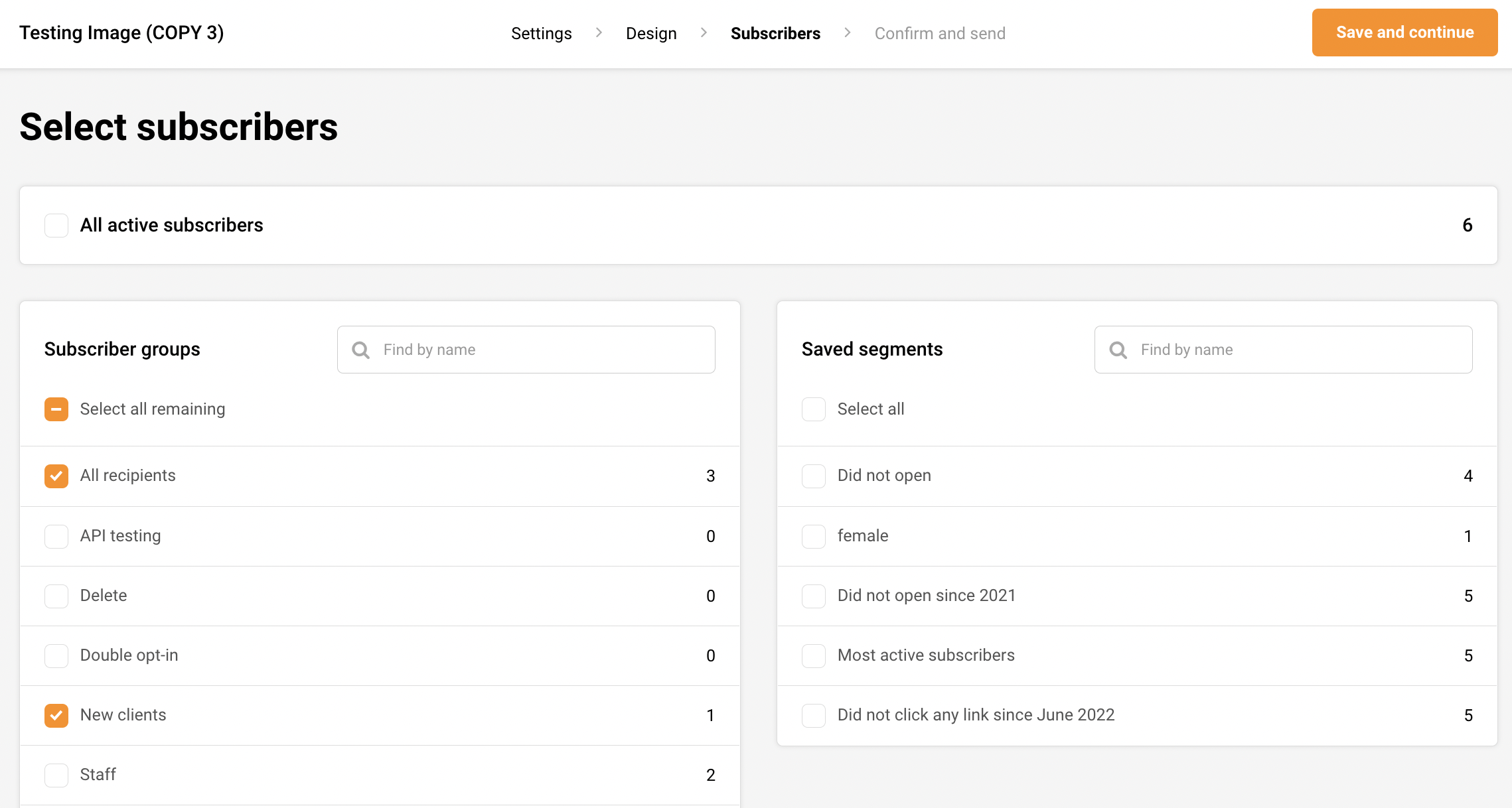 At this step, you will need to select a group(s) that will receive the campaign, then click the “Save and continue” button.