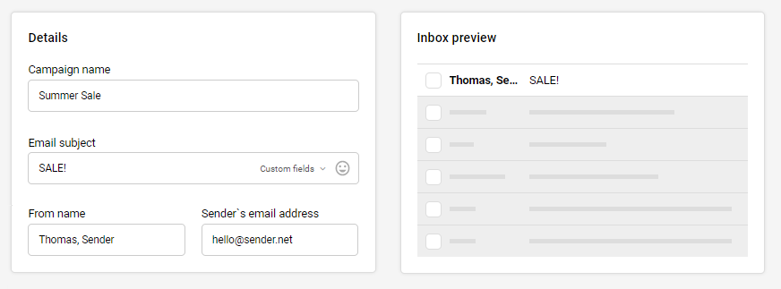 Next, the first tablet called “Details” is where you type email subject, reply-to address, and “from name”. The second piece, named “Inbox preview” renders how an email will look in the inbox. That’s a handy feature helping to create the best engaging and clickable email preview.