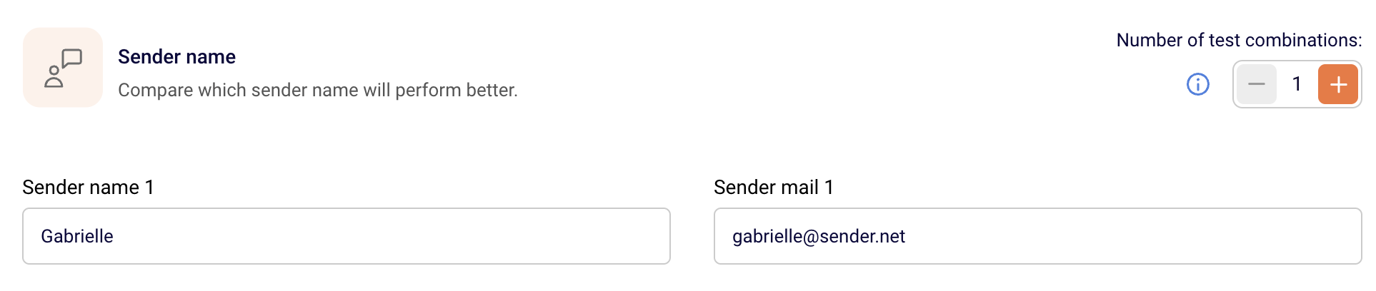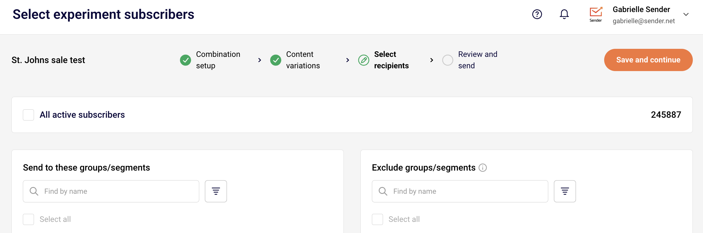 After that, select one sender name and email address that will stay consistent across all variations (since we’re only testing subject lines here). When you’re done, click Save and continue.
