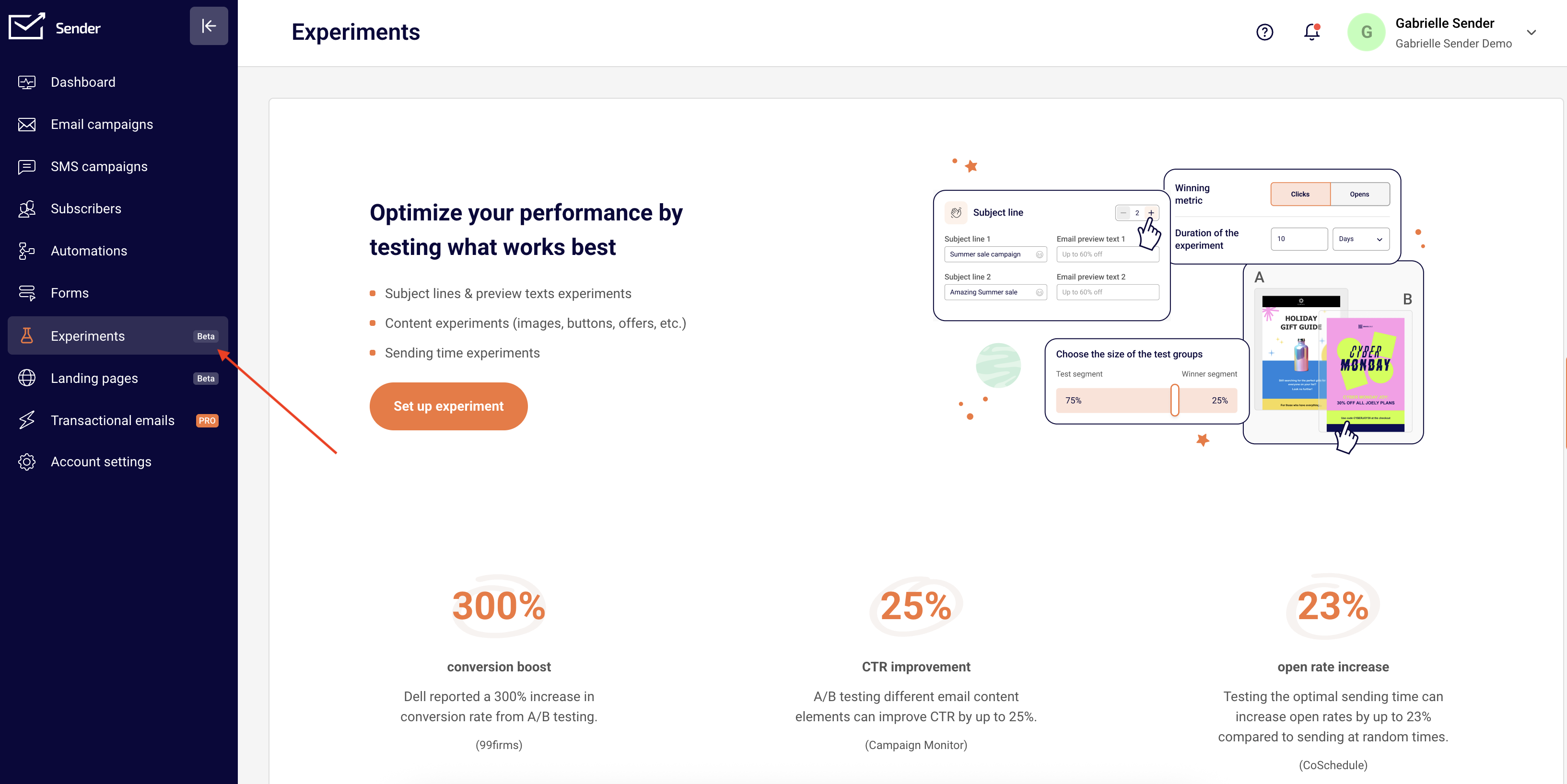 Our new Experiments feature is here to help you get the most out of every email campaign you send! With Experiments, you can easily test different versions of your emails—whether it’s the subject line, the sender name, the send time, or even the content itself.