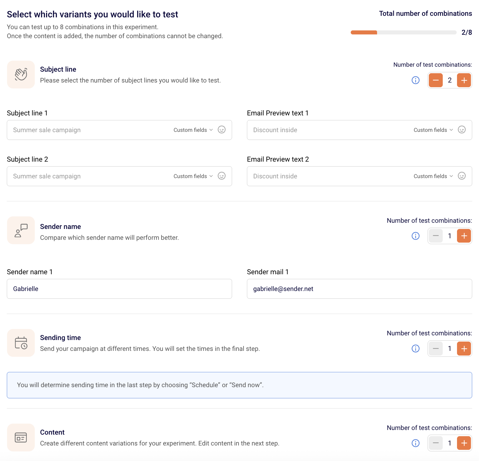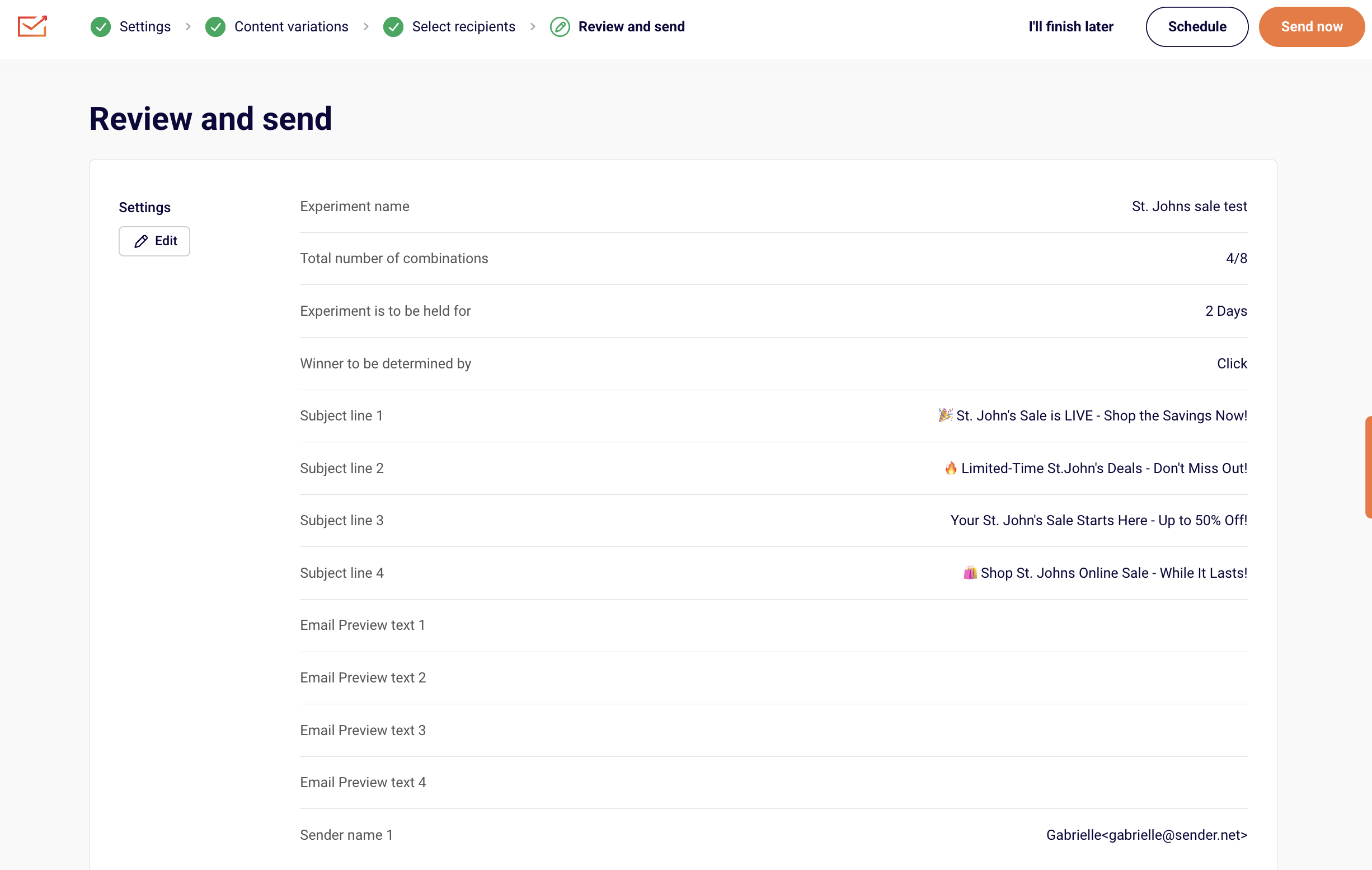 In the final step, you’ll see an overview of your experiment setup: all the subject lines, sender names, content variations, and testing settings.
