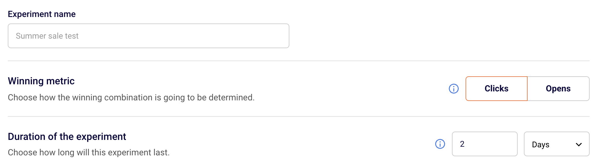 - Winning Metric: Select what metric will determine the winning variation—opens or clicks. (See below for tips on which to use.)