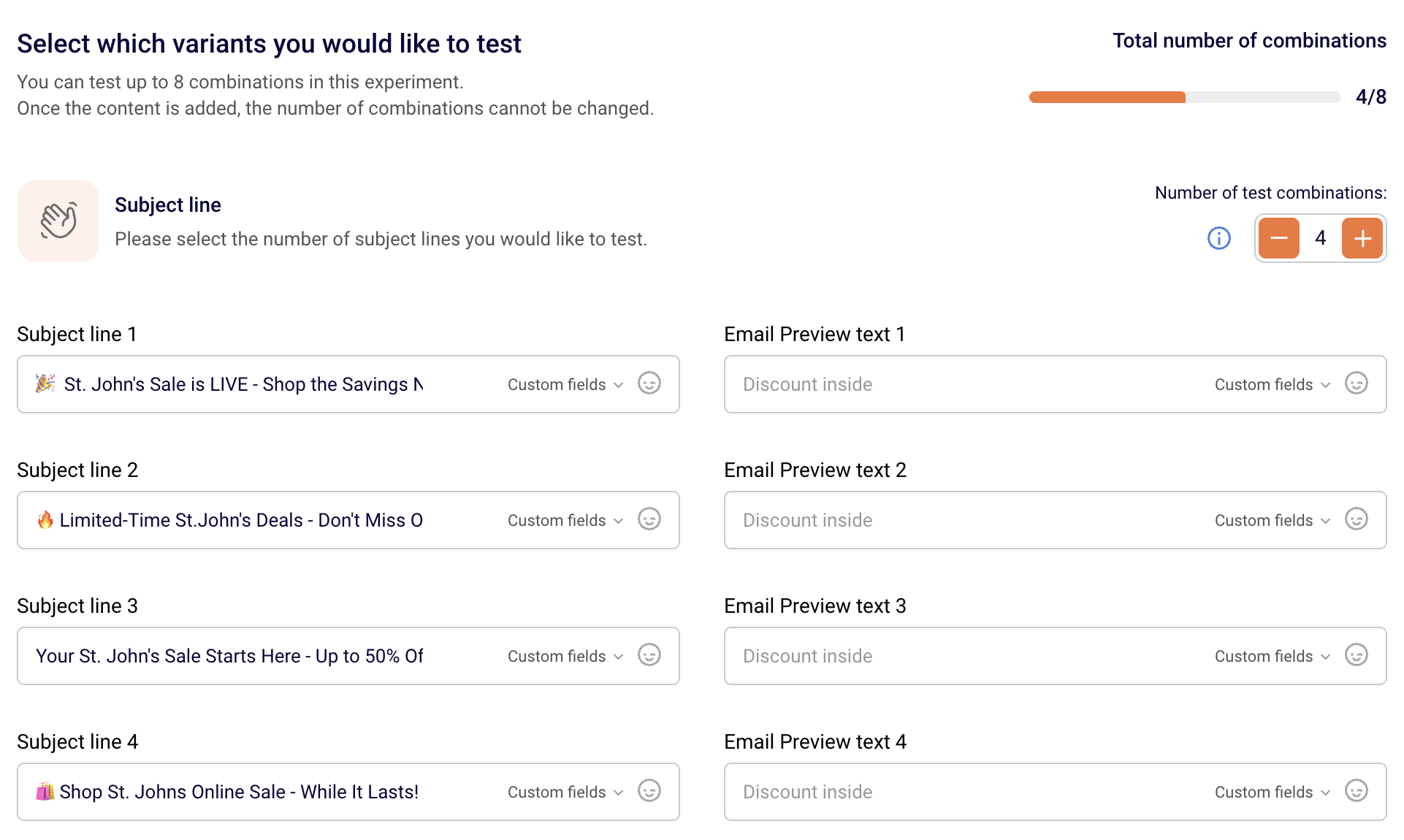 Here is an example of testing subject lines. Choose the Subject Line option, then enter all the variations you want to test.
