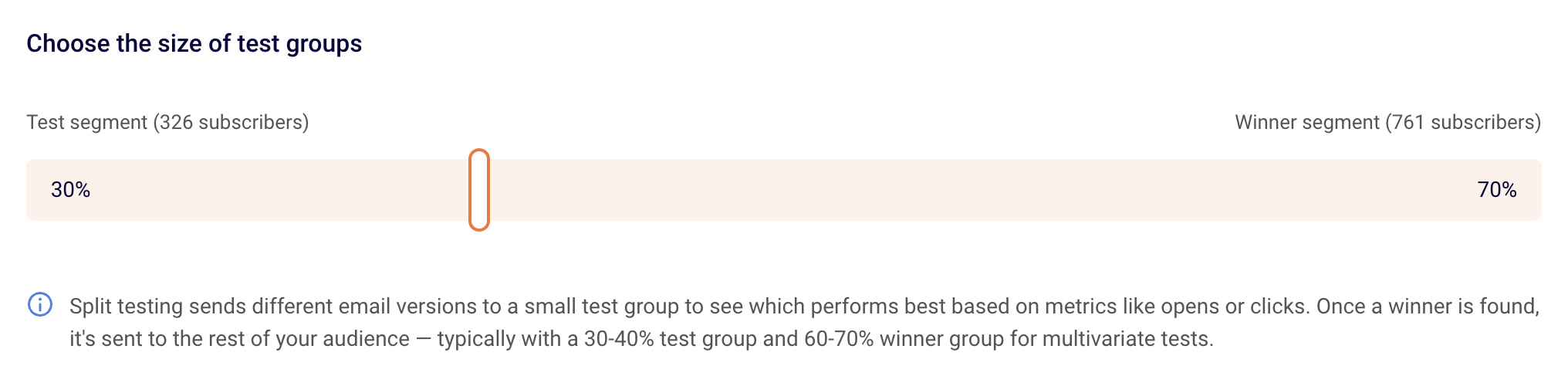 Test Group Size: Define what percentage of your total audience will receive the test. For example, if you’re sending to 1,000 subscribers, you might choose 30% (300 people) for testing.