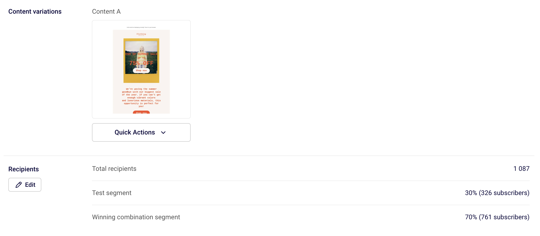Once the test group receives all the selected combinations and the duration ends, Sender will automatically determine the winner based on your chosen metric and send it to the remaining (Winning) audience.