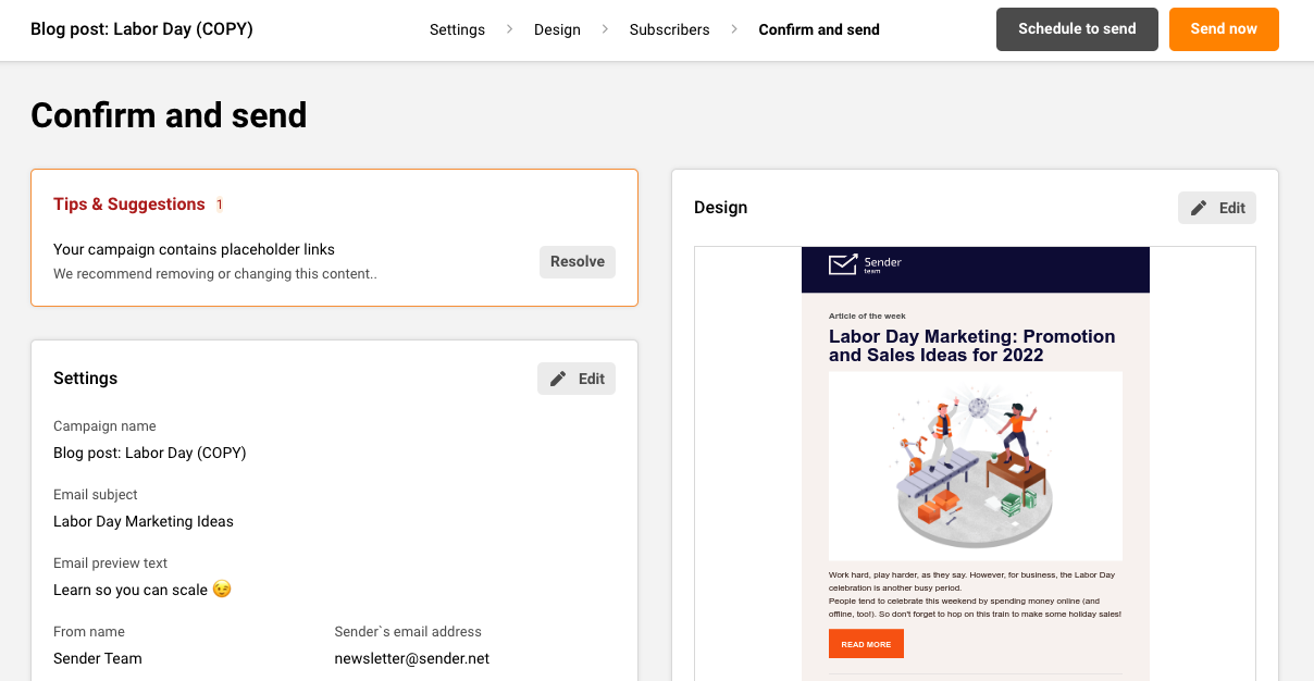 Campaign scheduling is done in the last step of campaign creation – when you’re done with campaign design, continue with the following steps until you reach the final stage.