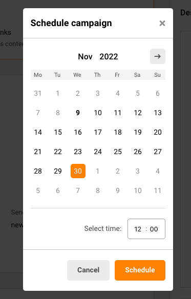 When the schedule button is clicked, a calendar will appear – pick a date and time on which the email will be delivered. Campaigns are sent according to your account’s timezone.