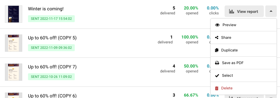 Go to Email campaigns, click the arrow next to the campaign in question and choose “Share”.