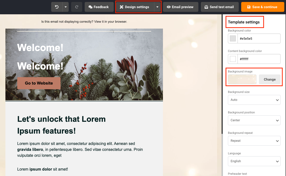 To add a background image to the whole campaign, click “Design settings”, on the right side, you will see Background image option in the “Template settings” section. Click “Change” and choose an image that you want.