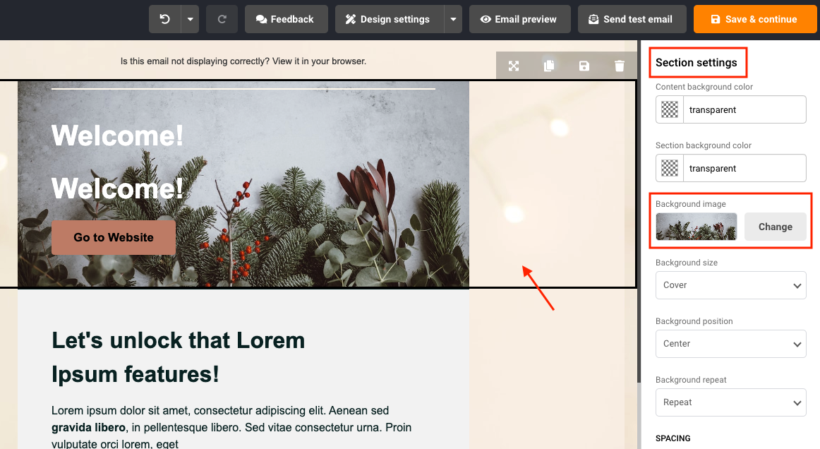 To add a background image to a section of the campaign, click on the section that you want to add the image to. On the right side, you will see Background image option in the “Section settings” section. Click “Change” and choose an image that you want.