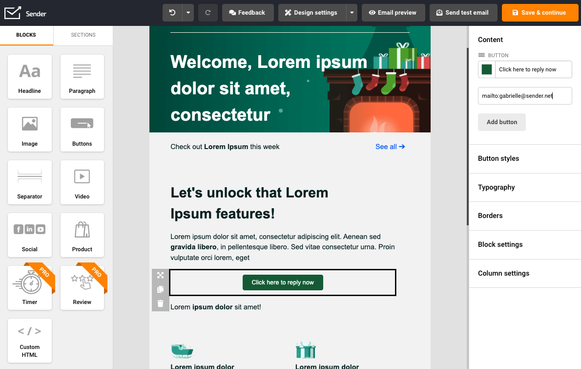 If you prioritize customer feedback, you should consider adding a visible reply-to button in the newsletter’s body. Creating a “reply” button is pretty simple. Firstly, you will need to drag the button element into the selected section.